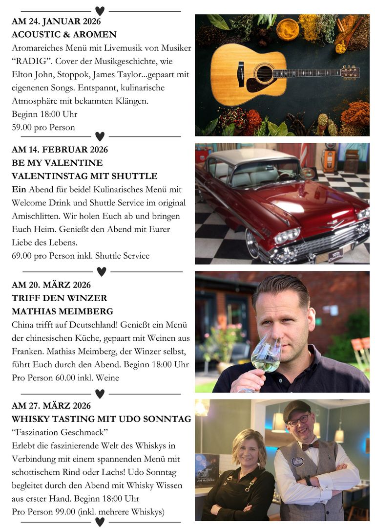 Wir laden wieder u.a. Musiker, Winzer und Whisky Experten zu uns ins Restaurant ein,