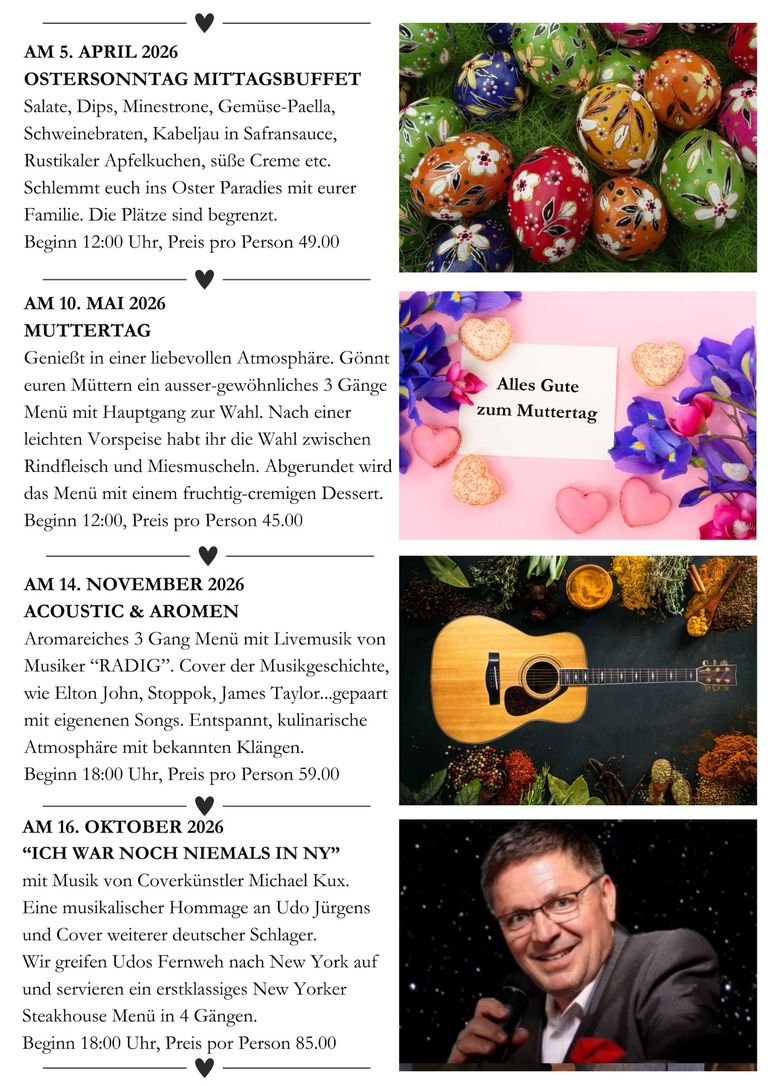 Geniessen Sie z.B. zum Ostersonntag ein reichliches Mittagsbuffet oder zum Muttertag ein tolles Mittagsmenü mit Ihren Lieben.